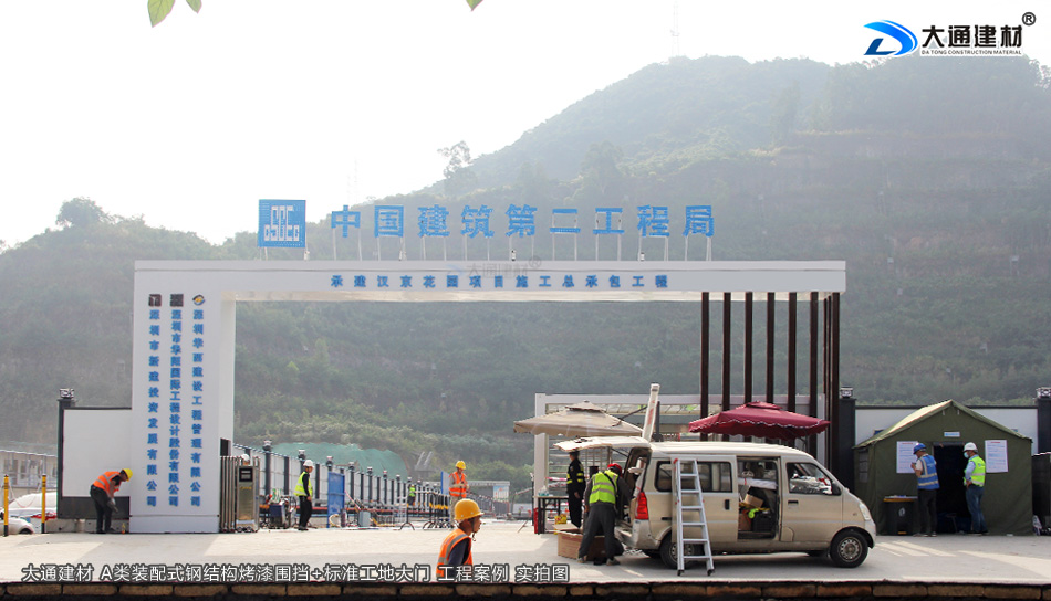 深圳市大通建材生產批發的 A類烤漆鋼結構圍擋半龍骨款+標準工地大門應用于廣東省深圳市南山區月亮灣漢京花園項目中,大通建材A類烤漆鋼結構圍擋半龍骨款符合深圳新市政標準,美觀、環保、安全、穩固,適合各類工程項目選用。下面為大家展示大通建材 A類烤漆鋼結構圍擋半龍骨款+標準工地大門 安裝好后的工程效果圖