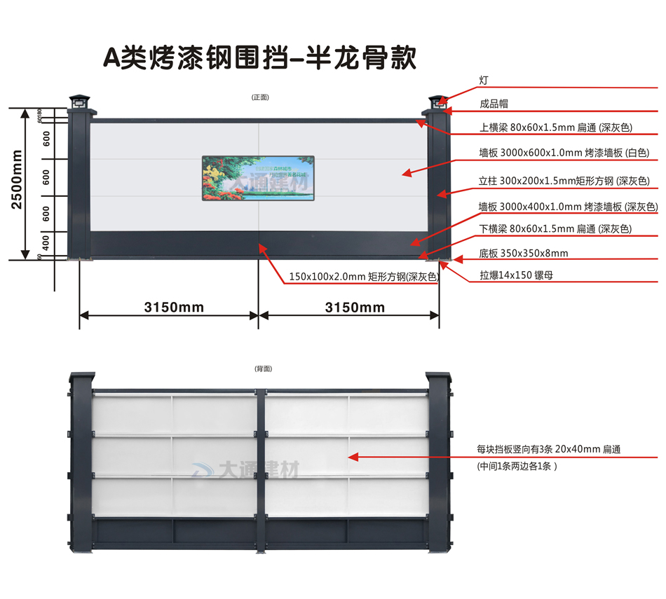 深圳市大通建材有限公司A類烤漆鋼圍擋-半龍骨款廠家直銷,美觀大氣、穩(wěn)固耐用;適用于深圳圍擋市政建設施工、房地產(chǎn)項目施工、地鐵項目施工、管網(wǎng)改造等工程,為很多項目施工工程提供圍擋批發(fā)、圍擋安裝及圍擋廣告業(yè)務。
