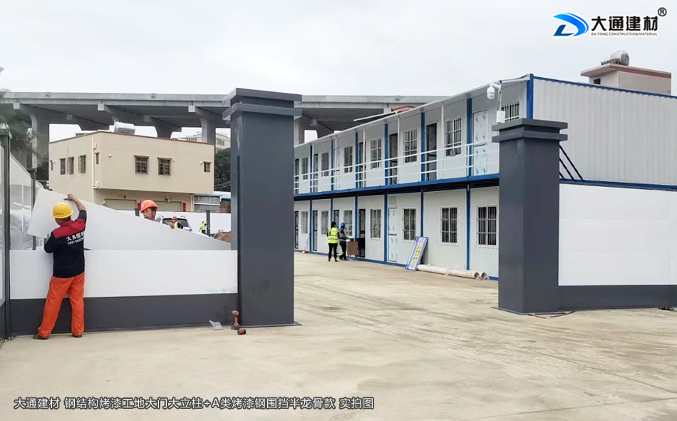 深圳建筑工地施工工程項目 選用了深圳市大通建材生產銷售/配送安裝的鋼結構烤漆工地大門+A類烤漆鋼圍擋半龍骨款