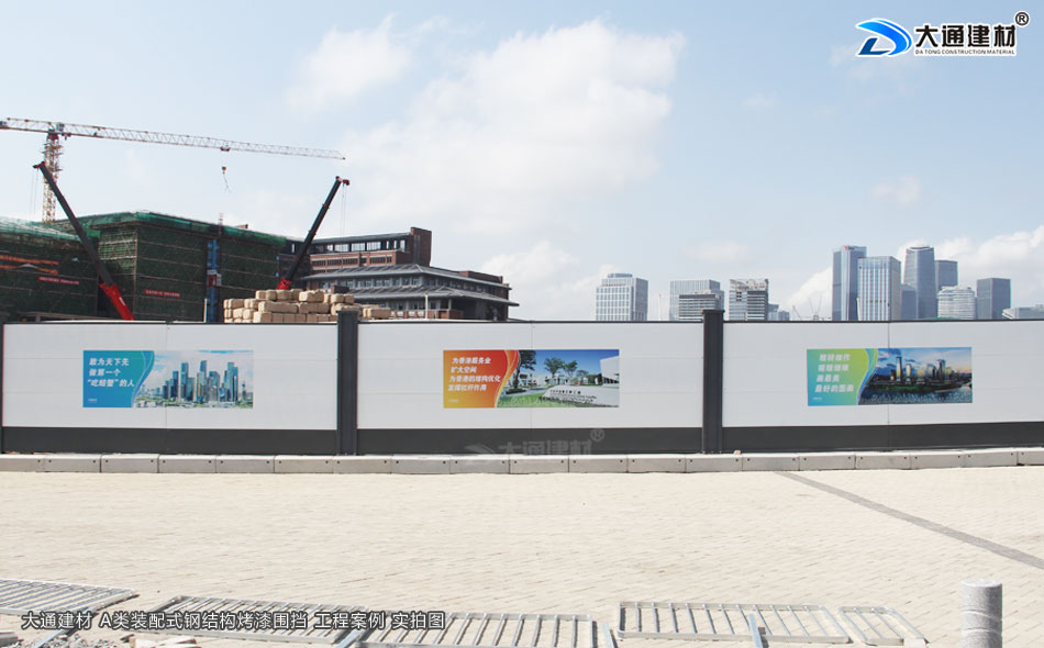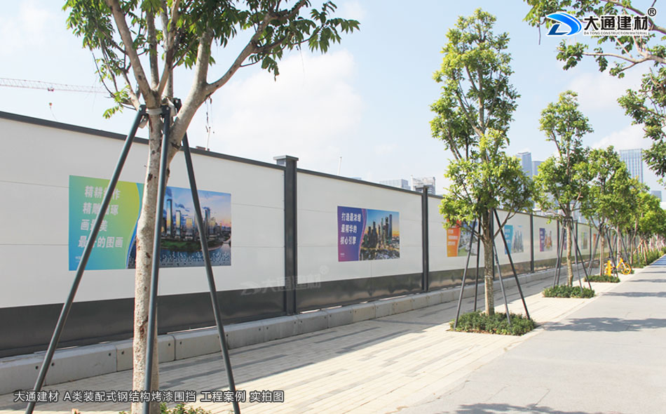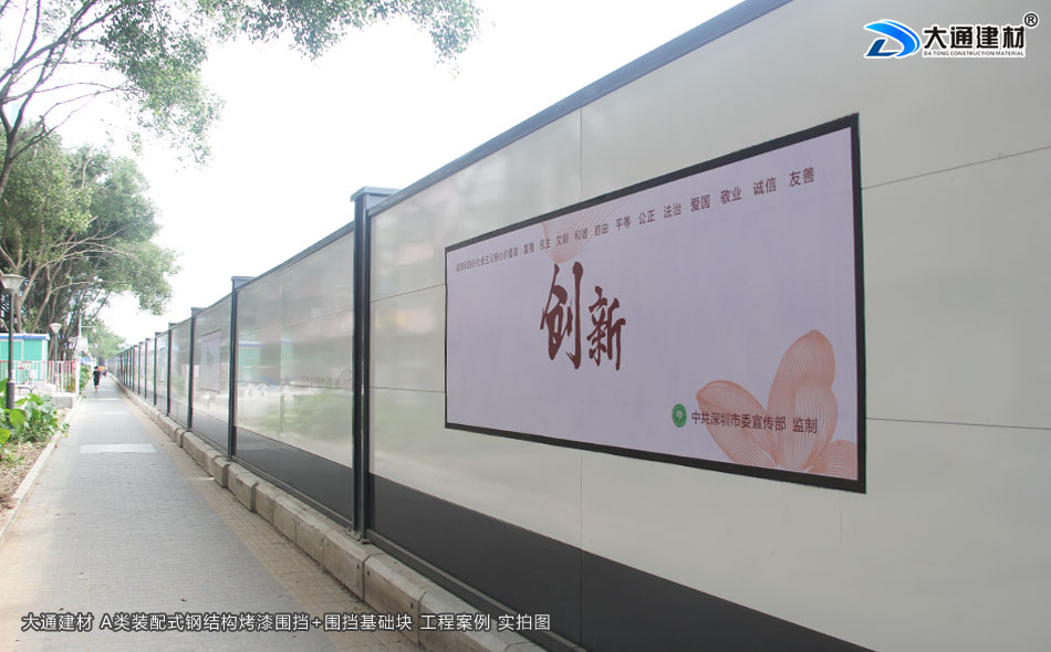 大通建材A類裝配式鋼圍擋,堅(jiān)持深圳質(zhì)量,關(guān)注城市美學(xué),培育精益求精的工匠精神,結(jié)合深圳開放、創(chuàng)新、現(xiàn)代、濱海的城市的特征和公益宣傳的要求。提供具備不同區(qū)域環(huán)境特點(diǎn)的外觀設(shè)計(jì)方案,外觀顏色可以是白色+深灰色烤漆擋板(亦可是全白色烤漆擋板),美觀大氣的現(xiàn)代風(fēng)格;再結(jié)合城市區(qū)域特點(diǎn),分片區(qū)、分道路、分街景各自選用同類風(fēng)格圍擋,營(yíng)造美觀、整潔的城市環(huán)境的同時(shí),實(shí)現(xiàn)圍擋風(fēng)格區(qū)域性的協(xié)調(diào)統(tǒng)一。