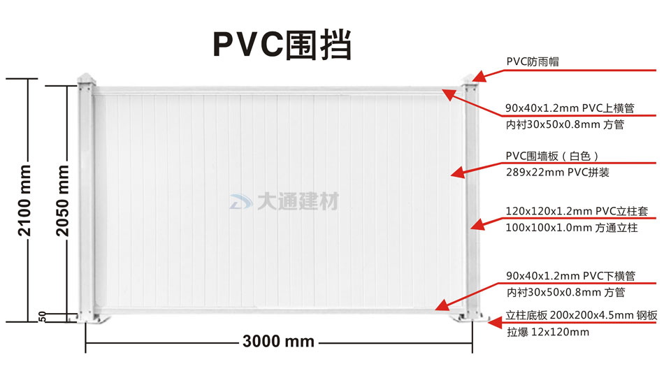 大通建材市政標(biāo)準(zhǔn)PVC圍擋2米高白色款材料規(guī)格參數(shù)介紹: