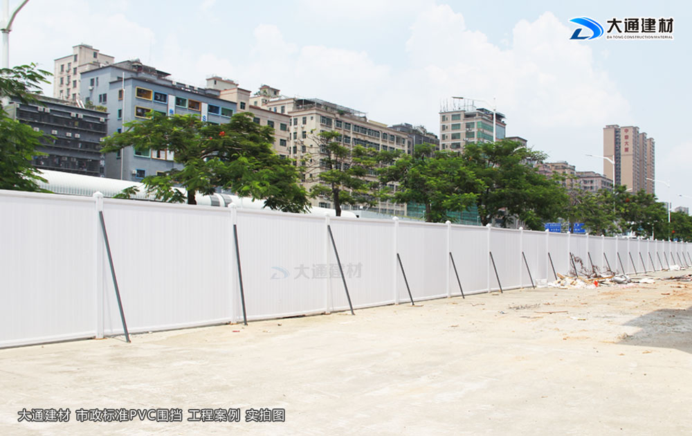 上述介紹的這款大通建材市政標(biāo)準(zhǔn)PVC圍擋的圍墻板采用白色PVC長條版拼接,而立柱、橫管均為白色PVC材料,內(nèi)部均襯塑鋼方通,立柱底板為鋼板,機(jī)動靈活,快速拆裝,簡單快捷牢固,經(jīng)濟(jì)實(shí)用、成本低; 并加斜支撐,增加受力,承載力大、抗風(fēng)阻系數(shù)高、穩(wěn)定性強(qiáng)。非常適用于市政建設(shè)施工、房地產(chǎn)項(xiàng)目施工、高架橋施工、地地鐵項(xiàng)目施工、路橋維護(hù)施工、隧道施工、立面改造施工、廠房隔斷施工等工程。